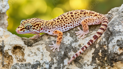 gecko, leopard, reptile, animal, rock, resting, calm, nature, yellow, bright, closeup, texture, pattern, spotted, tail, head, body, eye, leg, claw, cute, small, desert, environment, spot, sunlight, warm, wildlife, pet, creature, digital, background, closeup, scale, skin, earth, brown, cold-blooded, biology, herpetology, photo, climbing, terrain, colourful, stone, camouflage, climb, unique