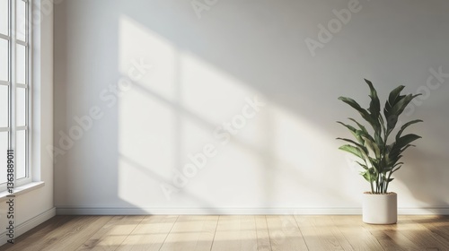 Bright, minimalist interior with natural light. Sunlight casts shadows on a white wall. A potted plant sits in the center of the room. Simple wooden floors