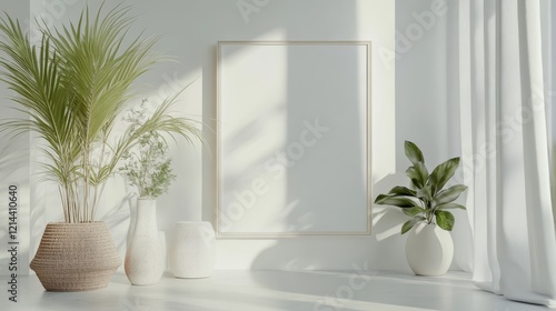 Bright Minimalist Interior with Plants and Empty Frame for Artwork