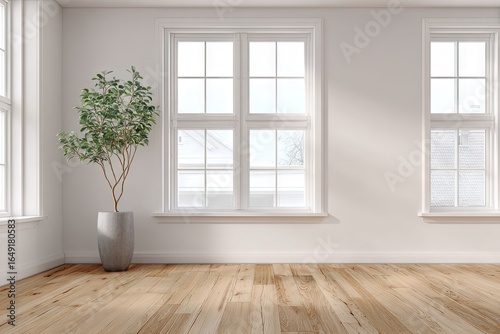 room, interior, minimalist, modern, bright, light, roomy, window, plant, potted, floor, wooden, empty, white, wall, clean, simple, design, decor, contemporary, sunlit, natural, empty space, neutral, home, house, living, apartment, view, winter, calm, peaceful, elegant, cosy, fresh, uncluttered, blank, photorealistic, digital, rendering, interior design