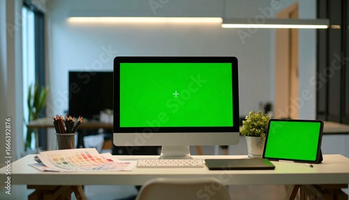 Bright minimalist workspace with an open laptop displaying a green screen on a white desk, illuminated by sunlight, perfect for digital content and mockups