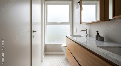bathroom, modern, wooden, vanity, white, tile, large, window, contemporary, interior, design, home, decor, lighting, cleanliness, minimalist, plumbing, sink, faucet, mirror, bright, roomy, neutral, colours, architecture, renovation, household, facility, workspace, element, improvement