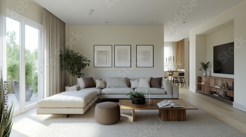 Bright modern living room with cozy neutral tones, soft textures, and stylish decor, offering a serene and inviting atmosphere