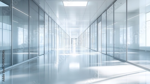 Bright modern office corridor, sleek glass walls, sunlit interior, clean minimalist design, polished floor, symmetrical perspective, corporate architecture, professional workspace.