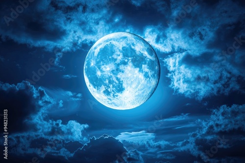 Bright moon shining through a partly cloudy night sky, clear weather, tranquil evening