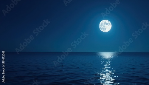 Bright moonlight paints silver path across tranquil ocean; full moon dominates dark sky , horizon, moonlight, water