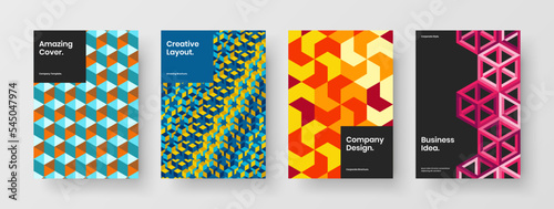 Bright mosaic hexagons booklet layout set. Unique magazine cover A4 vector design concept collection.