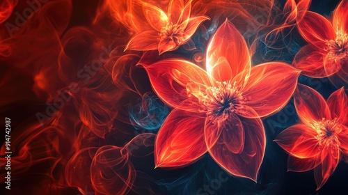 Bright neon flowers with burning elements on a dark red backdrop, powerful motion light energy for meditation