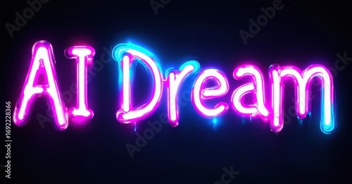 Bright neon sign displays AI Dream. Vivid pinks, blues create futuristic aesthetic. Dark background emphasizes glowing text.