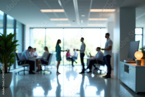 bright open modern office glass walls sleek furniture blurred motion people deep shadows shallow