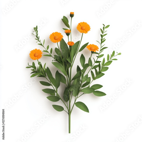 calendula, flower, orange, green, leaf, botanical, plant, nature, white background, vibrant, fresh, floral, herb, garden, natural, stem, foliage, blossom, bloom, decorative, arrangement, isolated, bright, colourful, organic, healing, medicative, herbal, summer, spring, beauty, elegant, simple, minimalistic, leaf