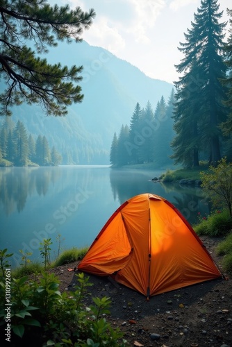 Bright orange canvas tent, reflecting misty lake, tranquil forest scene , photo, peaceful