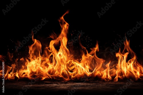 Bright orange flames rise against a dark background, creating a dramatic and intense fire scene with visible sparks and glowing light