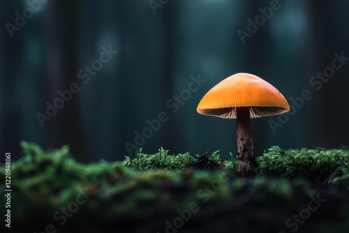 Bright orange mushroom stands alone on forest floor surrounded by green moss during early morning light