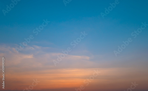 Bright orange sunset sky background with gentle colorful clouds, soft focus