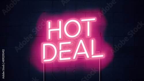 Bright pink neon sign displaying hot deal against a dark brick wall background, ideal for advertising, promotions, and marketing campaigns.