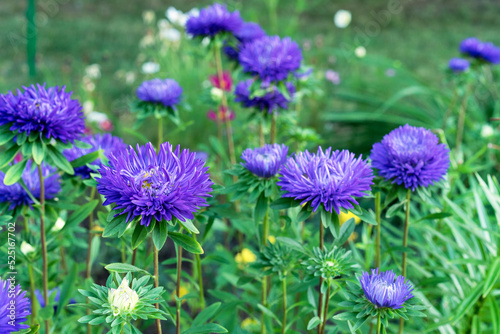 Bright purple asters flowers bloom in the garden. Flowerbed with violet asters.