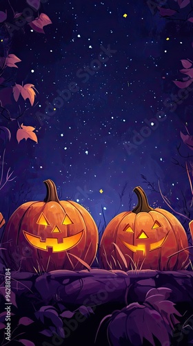 pumpkin, halloween, illustration, holiday, background, cute, purple, cheerful, autumn, celebration, cartoon, orange, skittish, party, bright, design, fun, symbol, vector, spider, night, character, fall, season, decoration, happy, october, banner, moon, invitation, treat, greeting, blue, hat, web, text, sorcerer, jack, poster, seasonal, joy, trick, lantern, wallpaper, scarey, vouchers, horror, grave