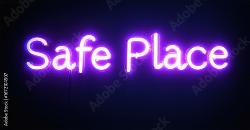 Bright purple neon sign displays words Safe Place against dark background. Simple message evokes feelings security, comfort.