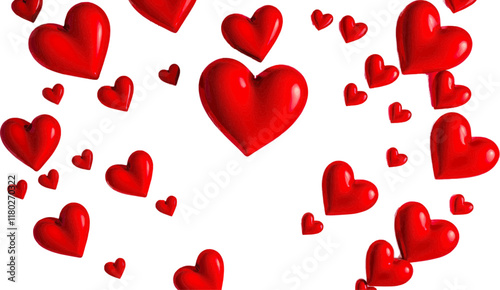 Bright red 3D hearts of varying sizes scattered across a clea background, symbolizing love, passion, and romance
