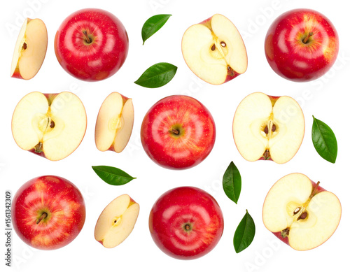 Bright red apple with bright green leaves and delicate flowers, isolated on white