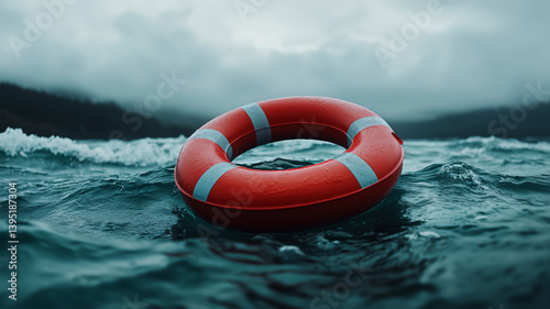 Bright red lifebuoy floating on stormy ocean waters under overcast skies, symbolizing rescue, survival, and maritime safety in dramatic conditions
