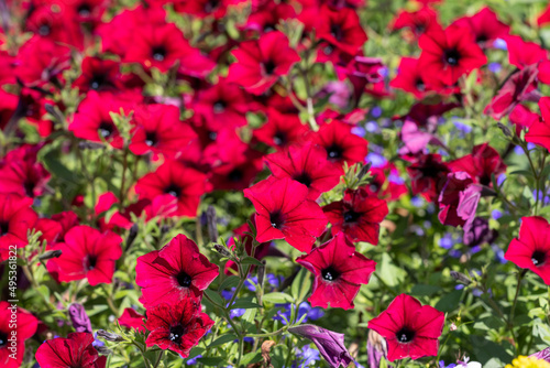 Bright red petunia flower carpet, abundant bloom on a sunny day