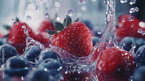 Bright red strawberries and juicy blueberries splashing into water, with dynamic droplets frozen mid-motion.