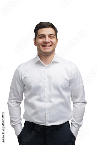 Bright smile and confident demeanor of a young man dressed in a crisp white shirt against a sleek background