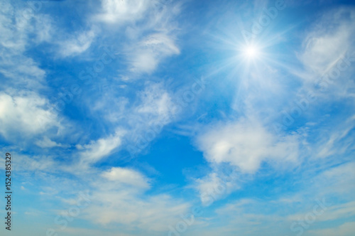 Bright sun and white clouds in blue sky on summer day.