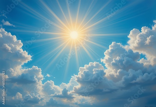 Bright sun shining through a vibrant blue sky filled with fluffy white clouds illuminating the