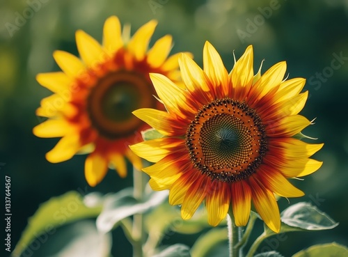 Bright sunflowers basking in the warm sunlight against a green backdrop.
