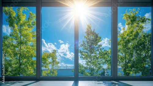 window, tree, sun, sky, nature, green, daylight, bright, sunshine, view, landscape, summer, leaf, foliage, cloud, blue, scene, day, light, glasses, pane, frame, spring, horizon, sunny, illumination, flora, environment, fresh, vitality, energy, serenity, calmness, calm, peaceful, aesthetic, beauty, colours