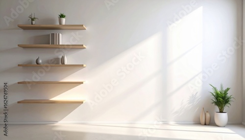 Bright White Wall with Stylish Shelves Displaying Lush Green Plants Creating a Fresh Tranquil Atmosphere