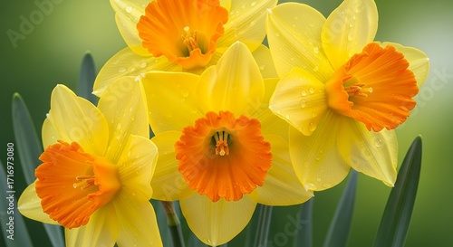 Bright Yellow Daffodils with Orange Centers Water Droplets in Fresh Garden Setting