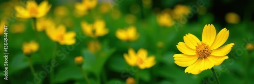 Bright yellow flower blooms amidst lush green foliage, garden, greenery, bloom