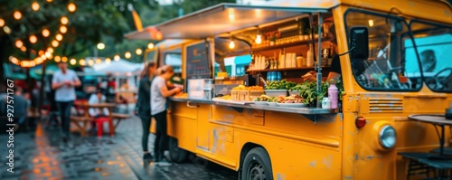Bright yellow food truck at a city festival, ready to serve, surrounded by festive decorations.