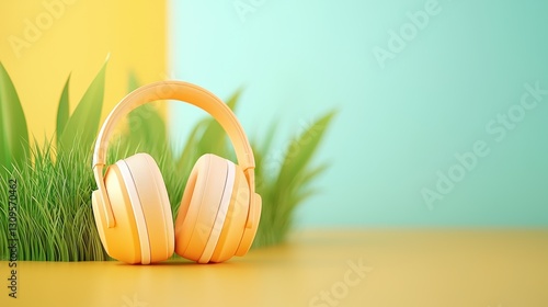 Bright yellow headphones rest on a vibrant background with green grass, creating a fresh and lively atmosphere.