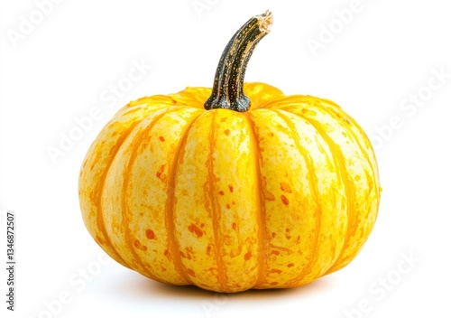 pumpkin, gourd, sitting, isolated, closeup, studio, yellow, orange, white, background, small, striped, seasonal, vegetable, crop, produce, raw, single, object, still life, autumn, fall, harvest, thanksgiving, halloween, festive, decoration, holiday, ingredient, food, cooking, culinary, healthy, eating, organic, fresh, market, display, celebration, agriculture