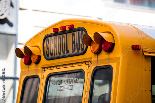 school bus, bus, street, city, transport, headlamp, school, building, vehicle, public, inscription, daytime, automobile, sunlight, parked, yellow, signs, manhattan, new york city, us, text, education, sunny, fragment, window, modern, automotive, us, door, district, urban, america, road, detail, signage, metropolis, element, avenue, outdoors, blurred background, horizontal