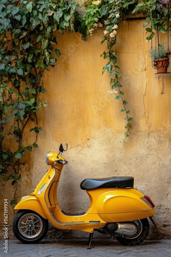 scooter, yellow, urban, wall, greenery, parked, city, transportation, charme, rustic, travel, lifestyle, summer, architecture, design, nature, vine, vintage, street, environment, vehicle, picturesque, sunlight, landscape, aesthetic, motorbike, destination, fun, culture, vibrant, leisure, community, scenic, colours, relaxing, quiet, life, element, stylish, exploration