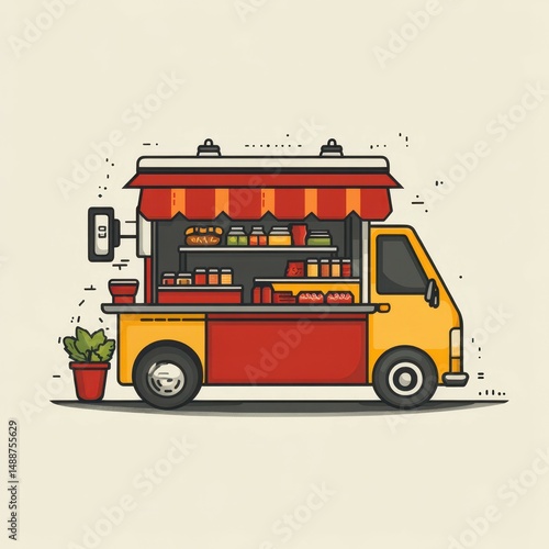 Brightly colored food truck serving snacks and drinks on a sunny day in an urban setting