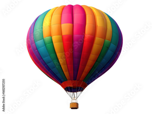 Brightly colored hot air balloon with vibrant rainbow panels floating against a clear background
