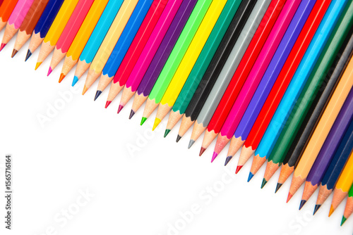 Brightly colored pencils in a horizontal row against a white surface. Perfect for promoting art materials, back-to-school, or creative inspiration imagery.