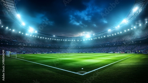 Brightly lit football soccer stadium at night, featuring a green field and grandstands, perfect for sports events, competitions, and live broadcasts.