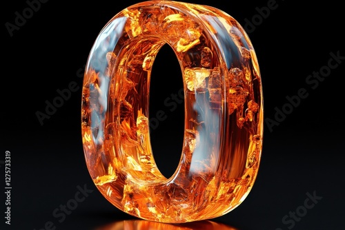 Brightly lit orange glass number zero with a circular shape and texture resembling molten material floating in a dark background at a creative design exhibition