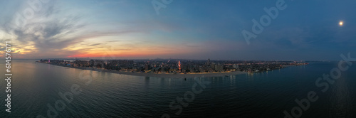 sunset, evening, dusk, manhattan, beach, brooklyn, island, brighton, panorama, panoramic, view, aerial, drone, water, atlantic, ocean, sand, real estate, waterfront, urban, new york city, new york city, outdoors, travel, landscape, scenic, city landscape, tower