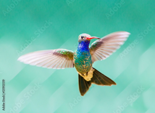 Broad Billed Hummingbird. Using different backgrounds the bird becomes more interesting and blends with the colors. These birds are native to Mexico and brighten up most gardens where flowers bloom.
