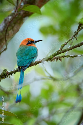 Broad-billed Motmot, Electron platyrhynchum. Tropical bird, rufous head and blue tail, native to wet forests of Bolivia, Brazil, Colombia, Costa Rica, Ecuador, Honduras, Nicaragua, Panama and Peru