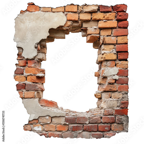 brick, wall, broken, hole, damage, texture, rough, aged, crumbling, decay, structure, material, element, architectural, construction, grunge, weathered, vintage, old, surface, passage, opening, arch, frame, segment, part, section, piece, transparent, background